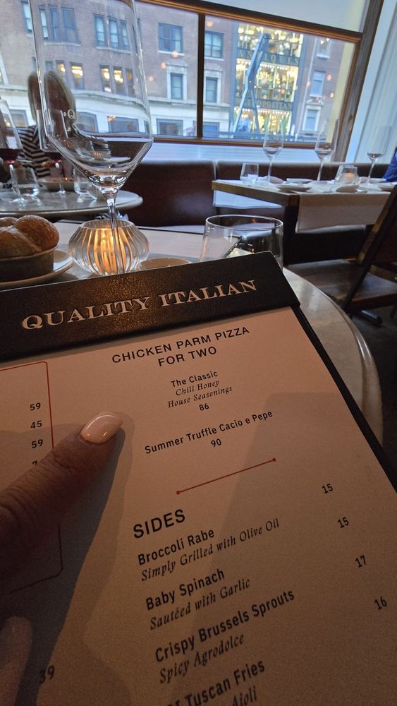 Welcome to Quality Italian, where Italian classics meet a modern twist in a vibrant atmosphere. Nestled in the heart of New York, this upscale steakhouse offers a mix of traditional and innovative dishes that cater to all tastes. Highlights include the famed Chicken Parm Vodka Pizza, a hearty favorite, and Poterhouse Agnolotti, both of which have received rave reviews from diners. The menu features both keto and pescatarian options, making it a great choice for diverse diets.